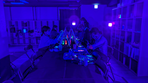 ダンスミュージックが流れるブラックライトに照らされた暗闇の中でドリンク片手に蛍光アクリル絵の具を使ったペインティングを楽しむ90分間のワークショップ型イベントです。